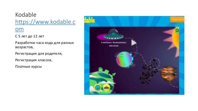 11. Kodable https://www.kodable.c om С 5 лет до 12 лет Разработки часа кода для разных возрастов, Регистрация для родителя, Регистрация классов, Платные курсы