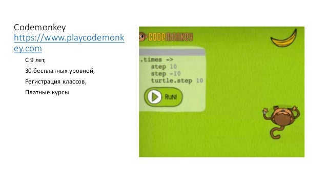 12. Codemonkey https://www.playcodemonk ey.com С 9 лет, 30 бесплатных уровней, Регистрация классов, Платные курсы