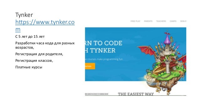 13. Tynker https://www.tynker.co m С 5 лет до 15 лет Разработки часа кода для разных возрастов, Регистрация для родителя, Регистрация классов, Платные курсы