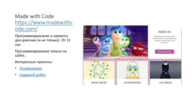 14. Made with Code https://www.madewithc ode.com/ Программирование и проекты для девочек (и не только). От 11 лет. Программирование только на сайте. Интересные проекты: • Головоломка • Садовый робот