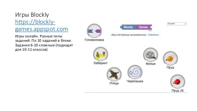 15. Игры Blockly https://blockly- games.appspot.com Игры онлайн. Разные типы заданий. По 10 заданий в блоке. Задания 6-10 сложные (подходят для 10-11 классов)