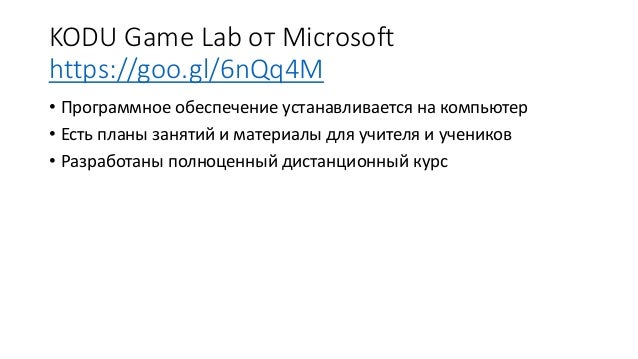17. KODU Game Lab от Microsoft https://goo.gl/6nQq4M • Программное обеспечение устанавливается на компьютер • Есть планы занятий и материалы для учителя и учеников • Разработаны полноценный дистанционный курс