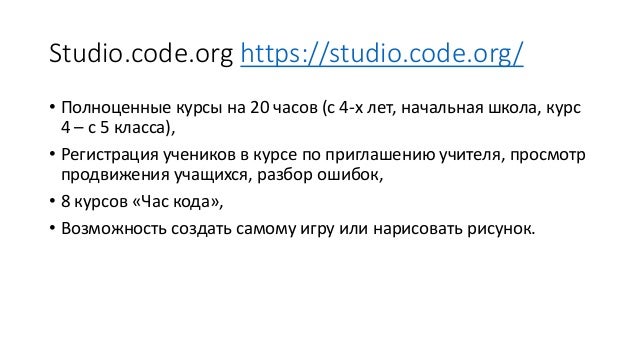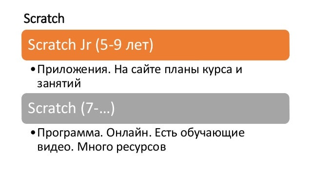 8. Scratch Scratch Jr (5-9 лет) •Приложения. На сайте планы курса и занятий Scratch (7-…) •Программа. Онлайн. Есть обучающие видео. Много ресурсов