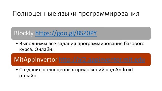 20. Полноценные языки программирования Blockly https://goo.gl/8SZ0PY • Выполнимы все задания программирования базового курса. Онлайн. MitAppInvertor http://ai2.appinventor.mit.edu • Создание полноценных приложений под Android онлайн.