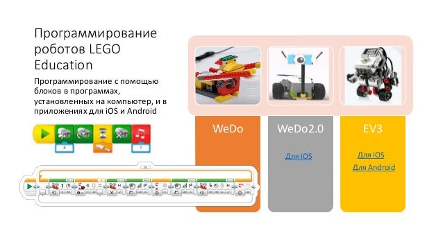 4. Программирование роботов LEGO Education WeDo WeDo2.0 EV3 Программирование с помощью блоков в программах, установленных на компьютер, и в приложениях для iOS и Android Для Android Для iOS Для iOS