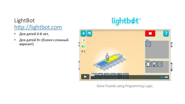 6. LightBot http://lightbot.com • Для детей 4-8 лет, • Для детей 9+ (более сложный вариант)