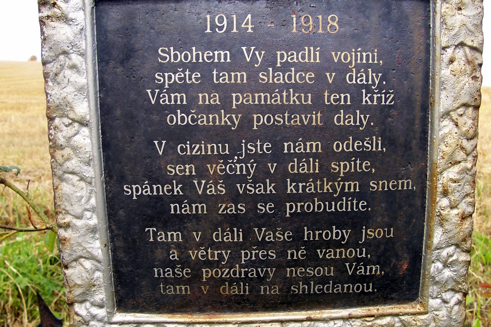 První světová válka (nebo také Velká válka, jak jí říkali současníci) se lidí v českých zemích citelně a krutě dotkla. Bylo jen málo rodin, které by mezi roky 1914 a 1918 neztratily na frontách otce, manžela, bratra nebo jiného příbuzného. Se ztrátami se obce vyrovnávaly o to bolestněji, že jejich padlí často nezemřeli na stejné straně fronty - jedni věrně sloužili svému císaři, druzí bojovali za vznik nového státu v legiích. Na mnoha pomnících padlým z tohoto období proto nenajdeme nic než jména nebo obecná hesla, žádné podrobnosti o tom, za co vlastně naši hrdinové bojovali.Při cestách českou krajinou můžeme najít nesčetné množství pomníků malých i velkých a na některých z nich se setkáme se zvláštními ukázkami lidské tvořivosti. Jeden zvláště dojemný příklad stojí u silnic z Pičína do Jankova, asi 10 km východně od jihočeských Votic. Stojí za to zastavit, přečíst si zvláštní veršovánku na pomníku a chvíli přemýšelt o lidech, kteří tak těžce nesli svou ztrátu, že nám o ní zanechali zprávu v podobě křížku v polích.Kudy tam: Pomníčků najdeme na venkově opravdu hodně, některé na návsích a náměstích, jiné v polích. Ty druhé bývají obvykle zajímavější. Tento konkrétní najdete tady.Zajímavosti v okolí: Když už to máme tak blízko, bylo by škoda se nezastavit na bojišti v Jankově, kde se odehrála jedna z rozhodujících bitev třicetileté války.Na co pozor: Většina pomníčků stojí těsně u silnic, někdy i dost rušných. Při čtení jmen a fotografování nezapomínejme, že za našimi zády jezdí auta...
