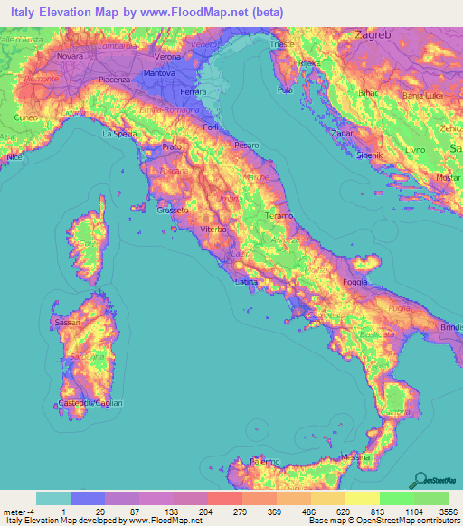The lowest elevation in italy is Jolanda di Savoia at −3.44 meters below sea level.