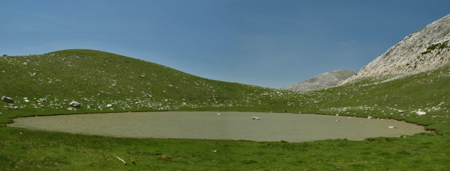 Si dura ha sido la subida nos queda la parte más complicada: la bajada al ibón de Ezkaurre; se trata una zona kárstica; a través de un estrecho canal, habrá que ayudarse de las manos en algún punto, y habrá que tomar las debidas precauciones, aunque tiene buenos agarres y apoyos. En apenas 700 metros tendremos que descender 300 metros entre rocas, sin ningún sendero definido.
