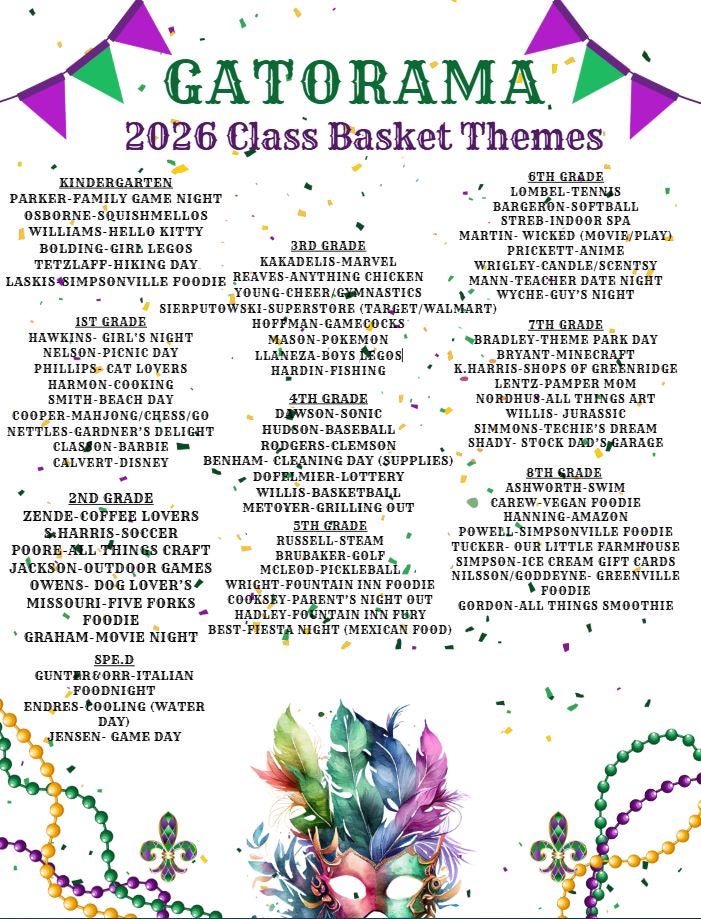 🎪 Gatorama Silent Auction: Each classroom is responsible for providing a basket for the Silent Auction. Basket themes have been assigned to each class. Room parents must turn in basket items to the Gatorama Chair by Wednesday, April 1. View classroom basket themes.