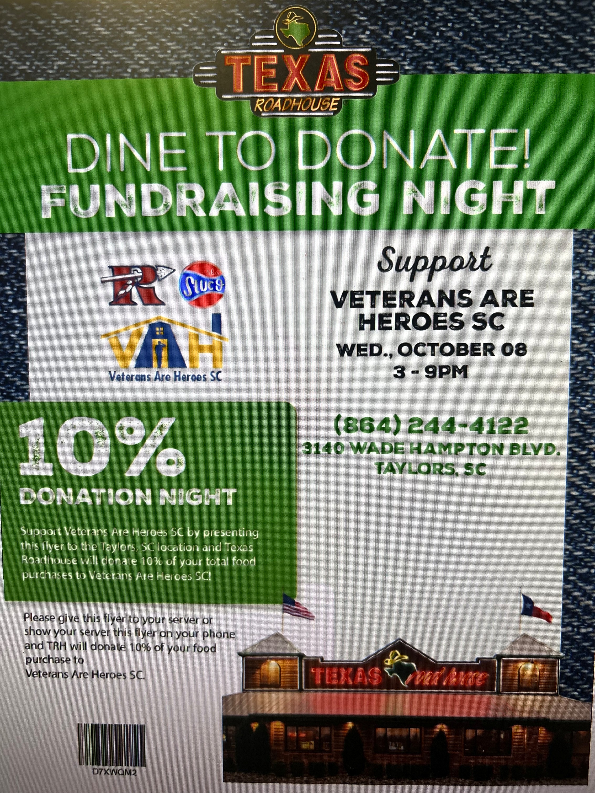 Wednesday, 10/8 - Texas Roadhouse on Wade Hampton from 4-9pm (with flyer)