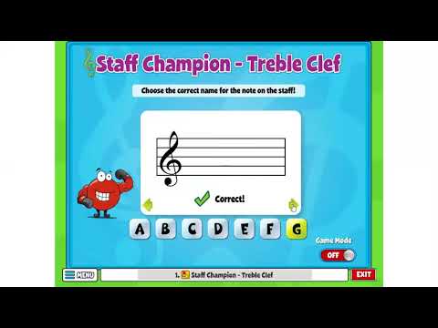 Starts with one note and then goes to words, getting harder. Can use the settings cog to change the speed. gives notes and then directly give the answer. Notes within the staff