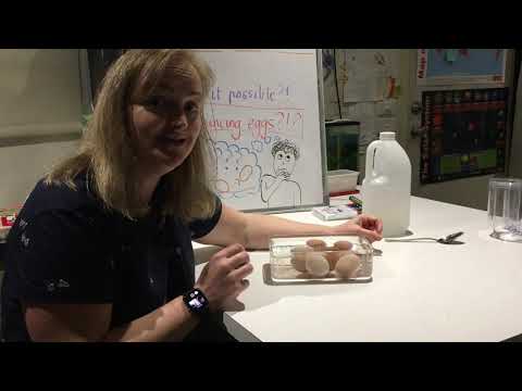 Can you make an egg BOUNCE? Not normally!! If you tried to bounce a fresh egg, the shell would break and you would end up with a great big mess! BUT.... if you soak the egg in vinegar for at least 24 hours, the vinegar will dissolve the shell. How? Well, the shell is made of calcium carbonate and the vinegar contains acetic acid. When these come into contact with each other, a chemical reaction occurs! The calcium carbonate is broken down into its parts - calcium and carbonate. The calcium dissolves into the vinegar (and becomes the scum you will see floating in the vinegar) and the carbonate reacts to make carbon dioxide gas - which you can see in the video as the bubbles which form on the egg shell!