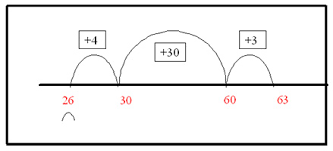 Lastly, addition or subtraction strategies can also be modelled with number lines. For instance, we can use an open number line (not every number is marked) to help us determine 26 + 37: