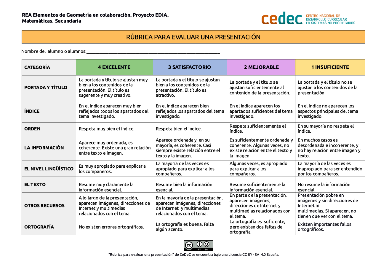 Rúbrica de la presentación