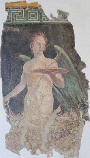 On the peristyle wall immediately west of the entrance to the triclinium was a fresco of a winged genius (pictured below). (For a re- construction of the north side of the peristyle see the image at the foot of the page).