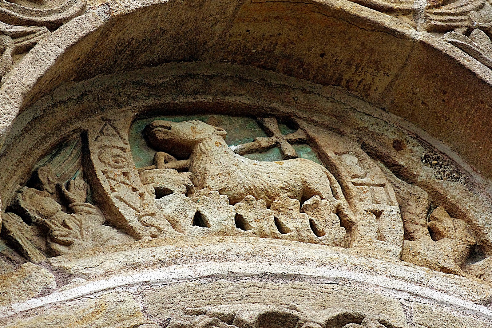 Le porche situé derrière ce portail, et couvrant sept marches supplémentaires, conduit à une façon de déambulatoire semi-elliptique, qui, s’appuyant sur des colonnes monolithiques, entoure un petit vaisseau central voûté en berceau.
