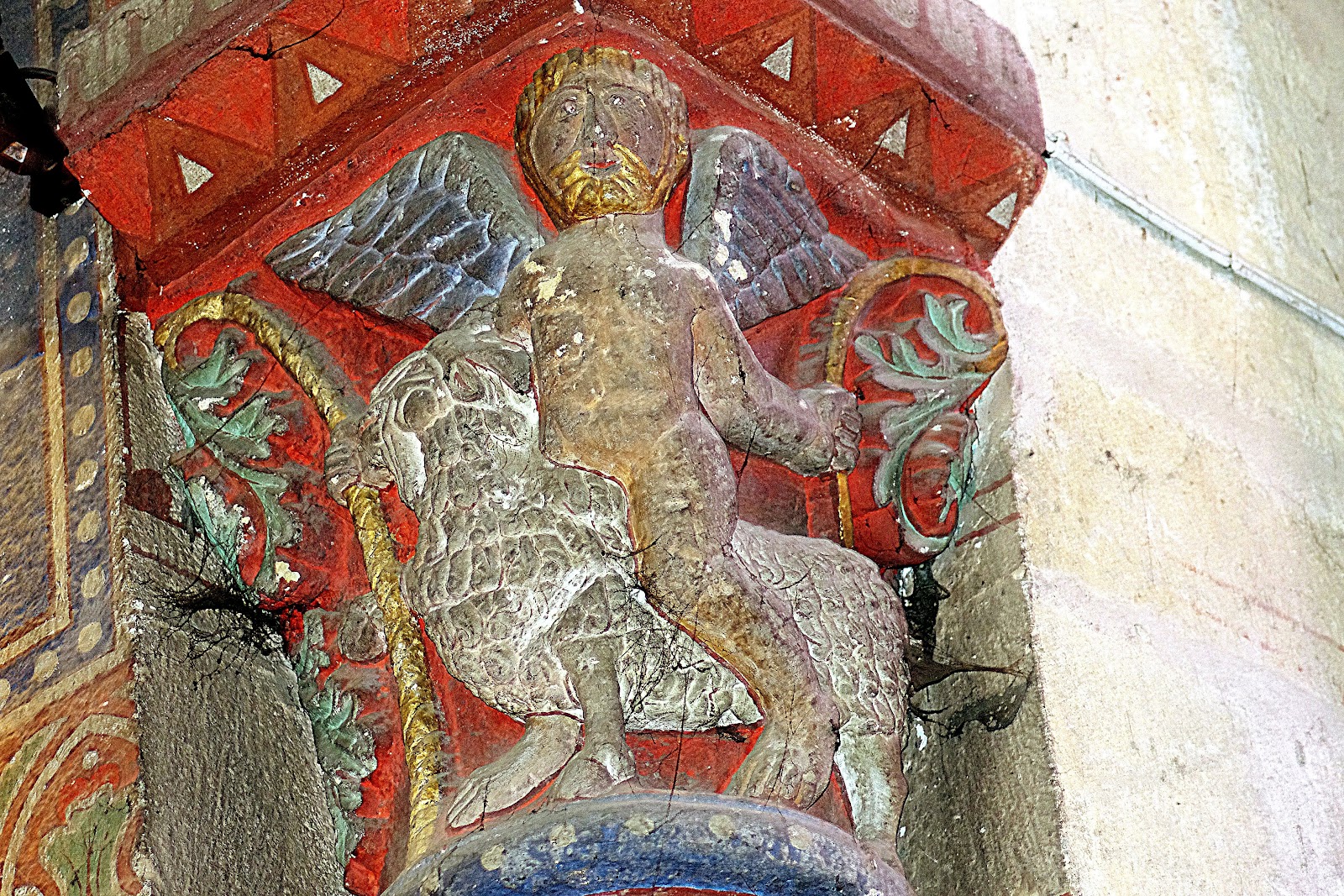 L'intérieur surprend par sa polychromie du XIIIe siècle, restituée par les travaux de restauration effectués au XIXè siècle.