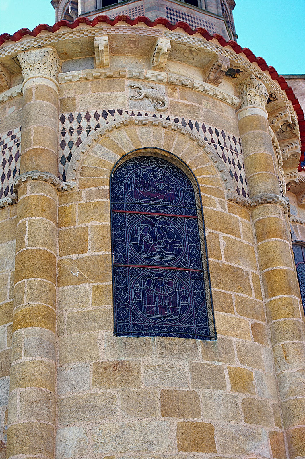 L'abbatiale Saint-Austremoine, construite en arkose présente un chevet roman auvergnat typique constitué d'un étagement de volumes de hauteur croissante :