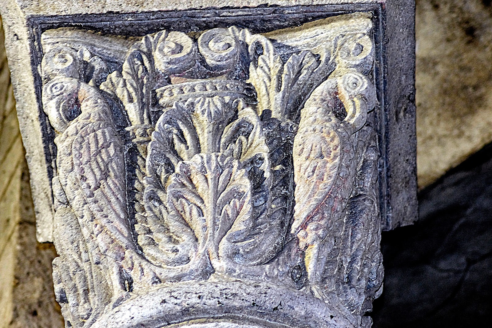 Outre les chapiteaux purement feuillagés, des chapiteaux de type "corinthien à figures" sont présents à Orcival.