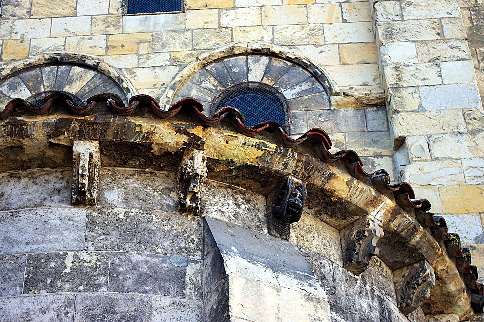 Ces modillons sont l’élement le plus intéressant de la sculpture de Saint-Etienne, et on y trouve rosaces, chevrons, losanges, perles, torsades, animaux et têtes de monstres.