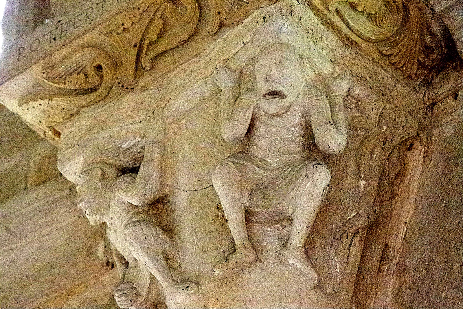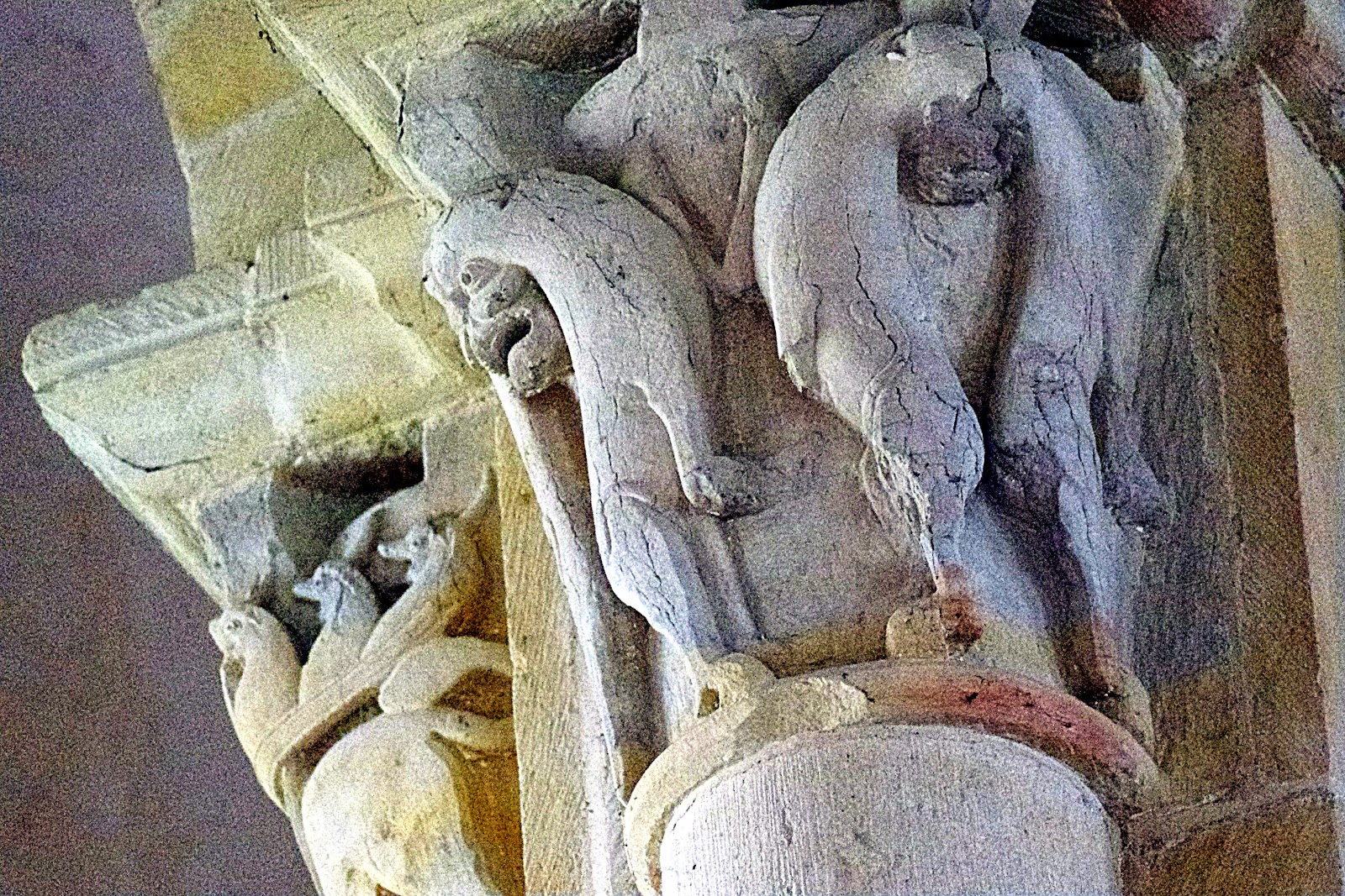 Sur les colonnes engagées du déambulatoire on trouve des animaux et le chapiteau des deux atlantes, où on peut lire l’inscription ROTBERTVS ME FECIT, la signature du sculpteur.