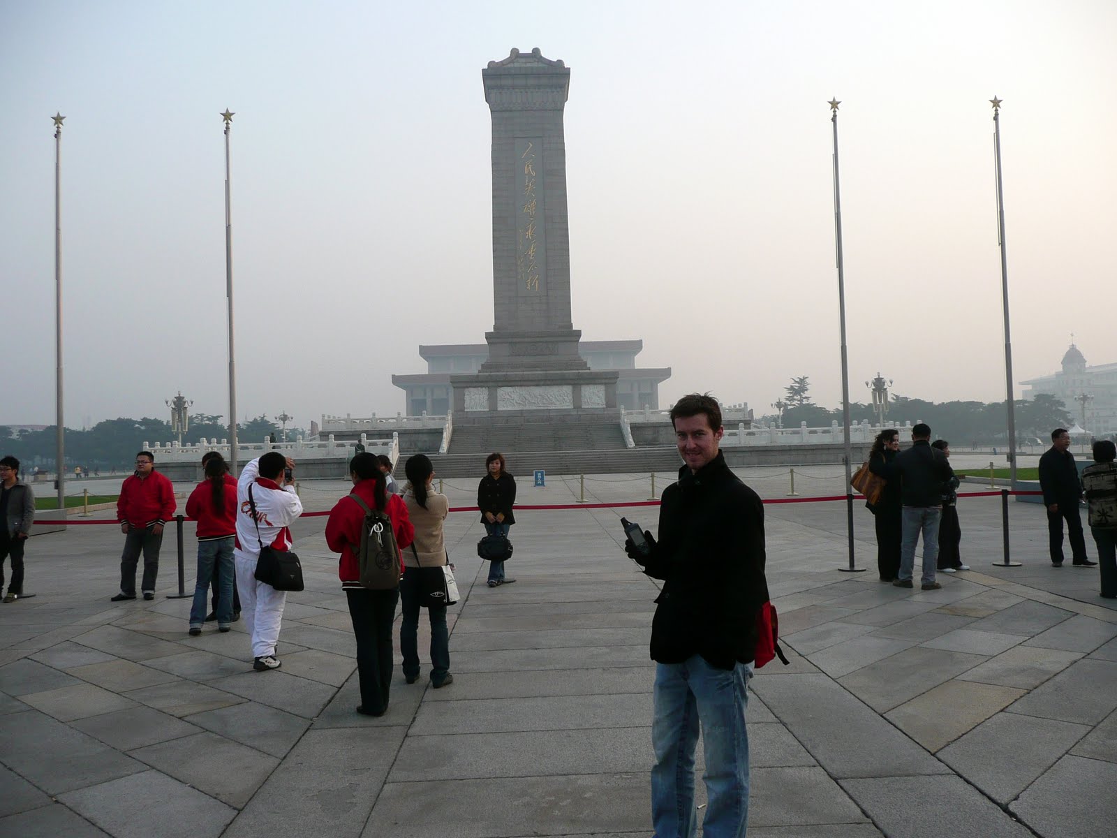 For the other virtual cache Tiananmen , Colin stood in front of a huge monument in front of Tian' anmen Square.