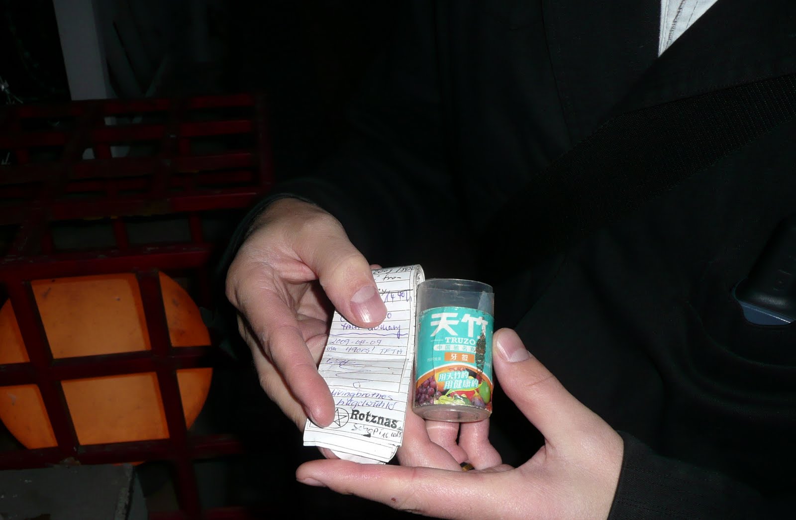 On Oct 31, 2009, we found this cache Can do - Yellow in a clear Chinese container stuffed in the metal opening of a bridge handle. This cache was only a few blocks from Catherine's apartment.