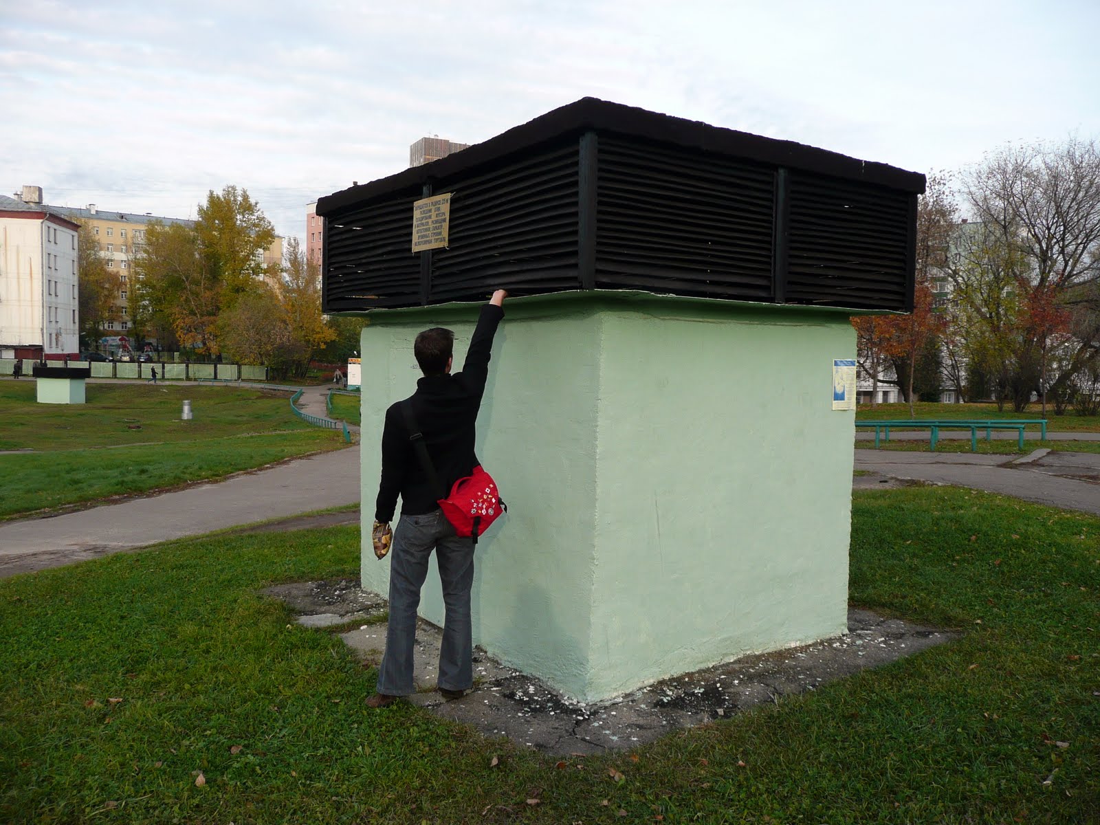 We only had time to look for and find one geocache in Moscow and it was called Look around... hidden very sneakily on the grates on the side of a building. It's in a park near a beautiful cathedral and statue of a rocket.
