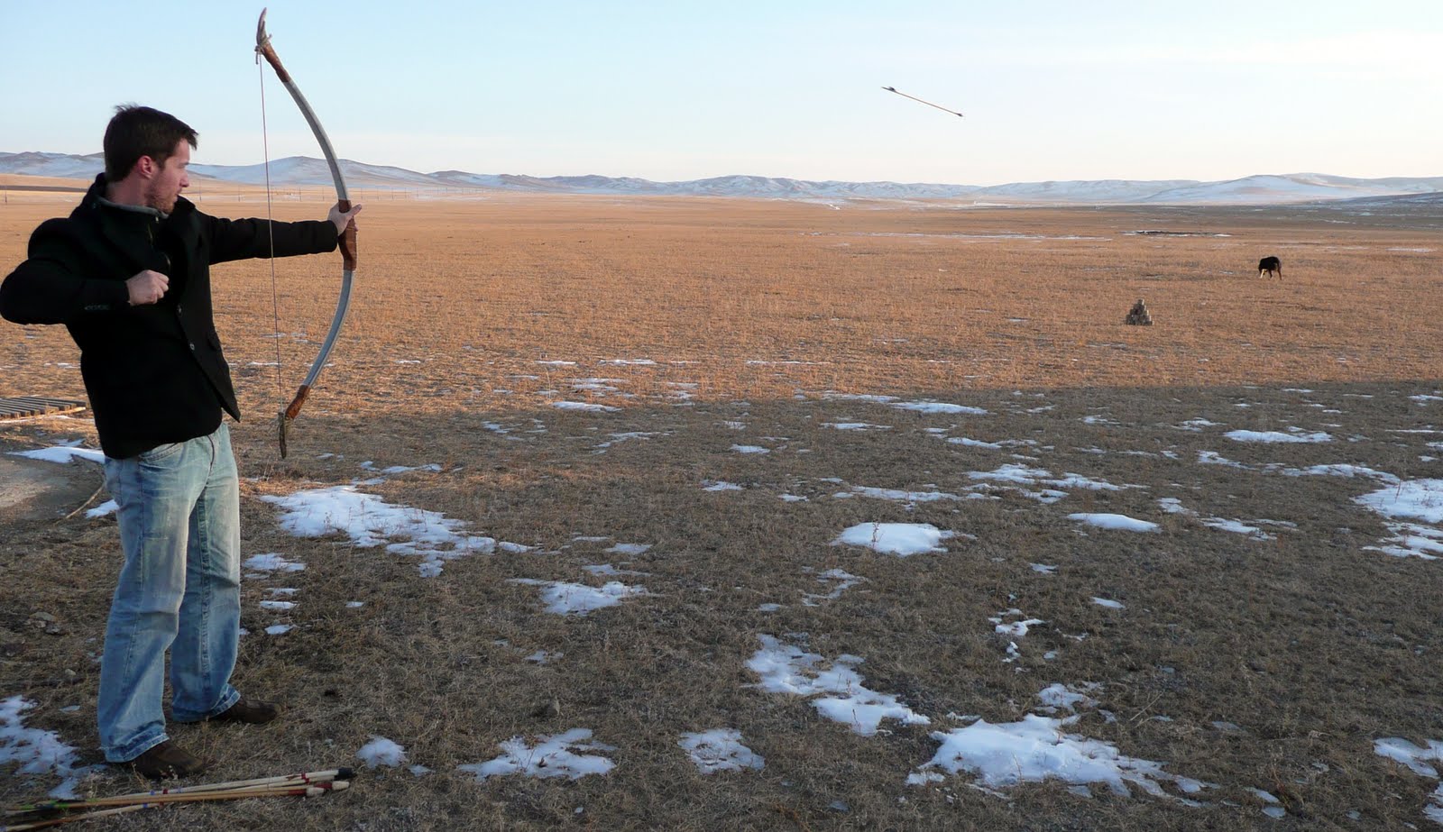 We played archery which was quite a challenge for me. It's a great workout for your arm muscles though. Naki also taught us a game called Shagai (Ankle Bone). The pieces for the game are made of sheep ankle bones. The bones are the dice and the pieces that you play with. You line up the pieces with the camel side of the bone facing up and you move our camel bone in a race depending on what you roll. If you roll 1 camel, 1 horse, 1 goat, and 1 sheep you get to move 4 spaces. If you roll 1-4 camels then you get to move that many spaces. I won but because I won, Colin got to pick some animals for me to act out just like in charades.