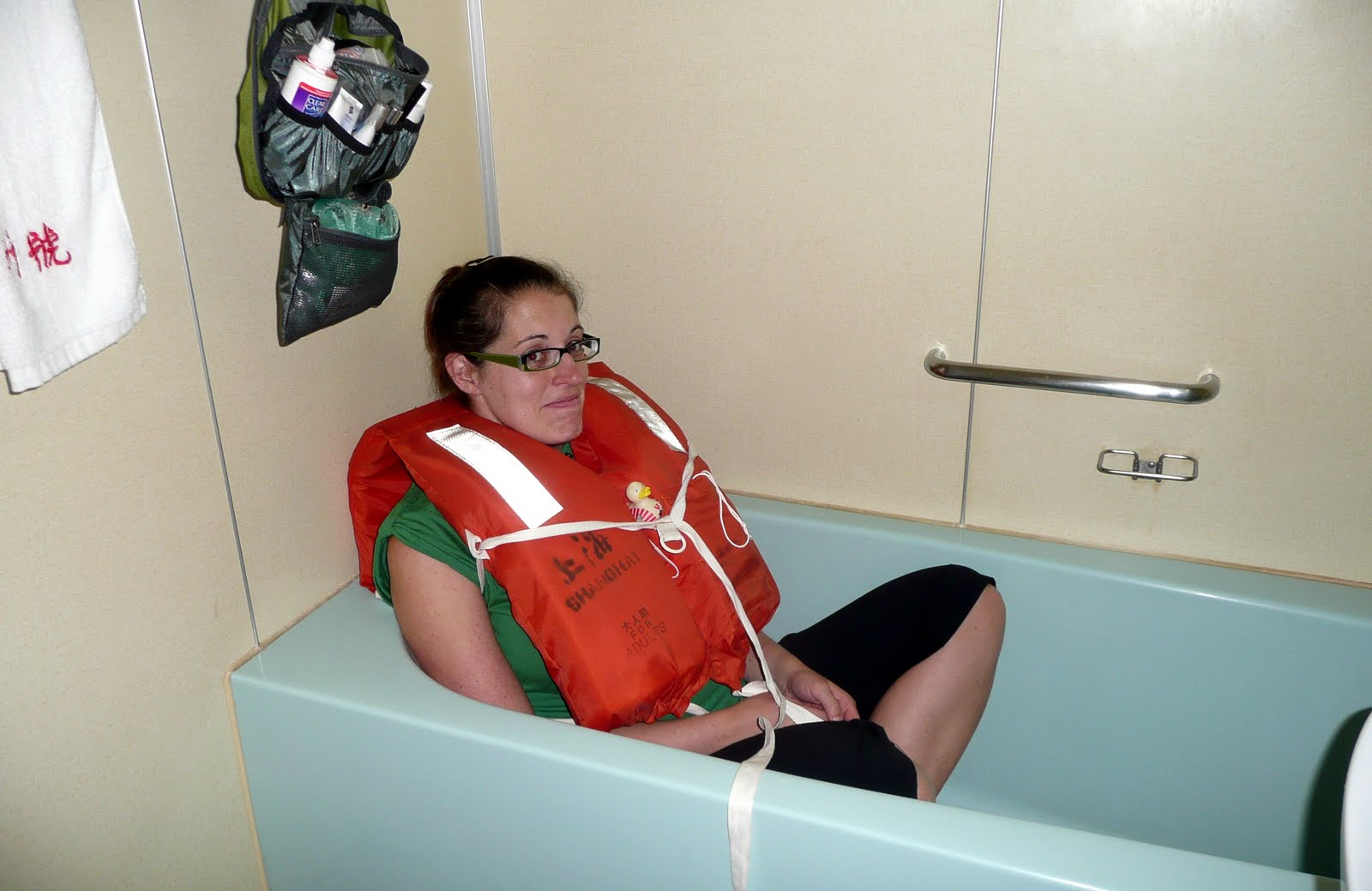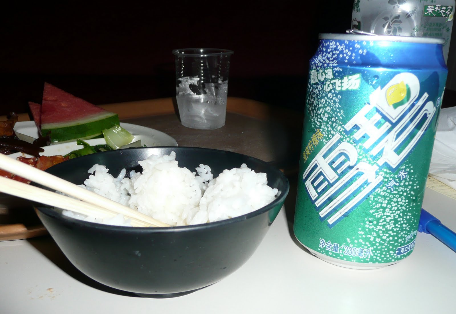 We heard breafast announced at 7 AM, lunch at noon and then dinner at 5:30 PM and we had still not left our beds or our rooms. We were running dangerously low on water and I would have paid any amount of money for a Sprite. The waves had lessened a bit and the pain in my stomach turned from nausea to ravenous. I put my pants on and tucked a blue seasickness bag into my pocket. I stumbled out of our room and down the stairs focusing on my hunger and thirst. There were less than 10 people in the dining room. I grabbed two waters, two Sprites and a plate of whatever they were serving for 770 RMB which is about 8 Cdn. I somehow made it back into our room and set the tray on the table. We both managed to eat a few bites of rice and a few bites of cabbage. We couldn't touch the meat though. After a full can of Sprite, we were feeling almost human and fell in and out of sleep for another restless night. All night I felt like a balloon that two kids were keeping in the air by hitting it back and forth. I floated around in my bed with each swelling wave.