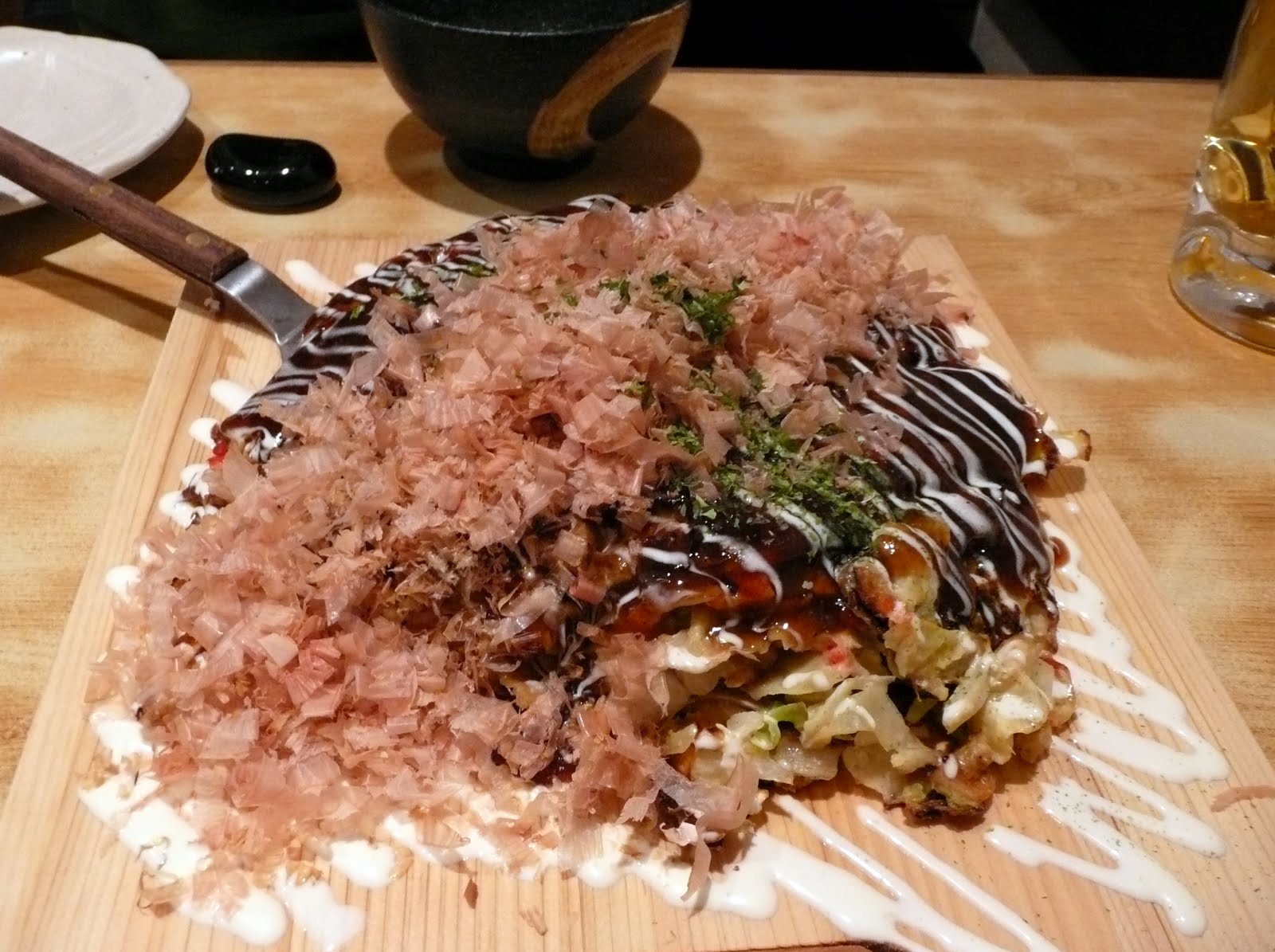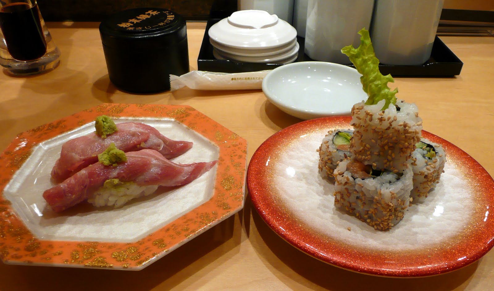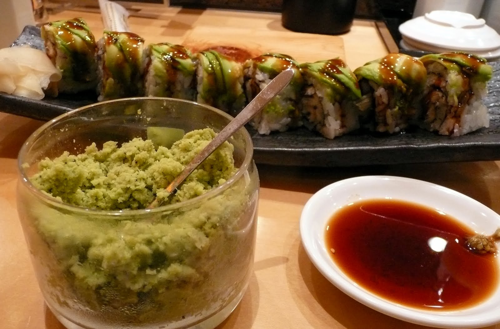 We felt like it was our first time eating sushi since we made the mistake of putting green tea powder into our soya sauce instead of wasabi. The sushi chefs laughed at us, but at least they noticed right away and told us. It didn't taste too bad though. We received a fresh container of wasabi. It also had black bits in it that looked like pepper. However, I think it looked this way because it was made from a wasabi plant instead of the dry powder and paste that we use at home.