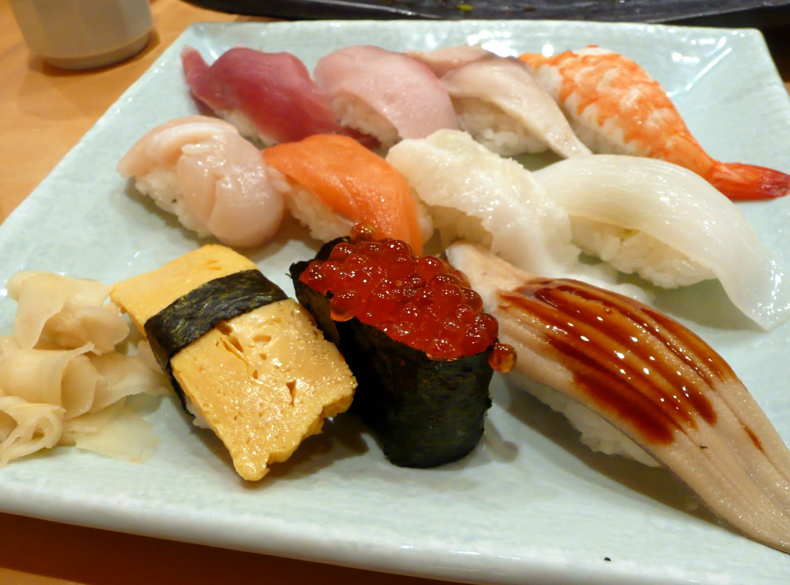 On the bottom right is eel. We've determined that we don't like eel. The texture is awful and it's rather fishy tasting.