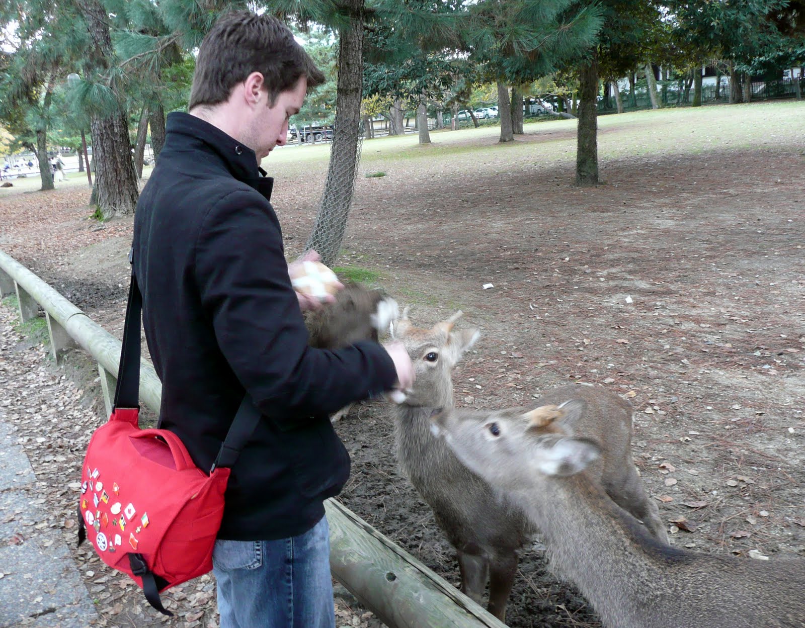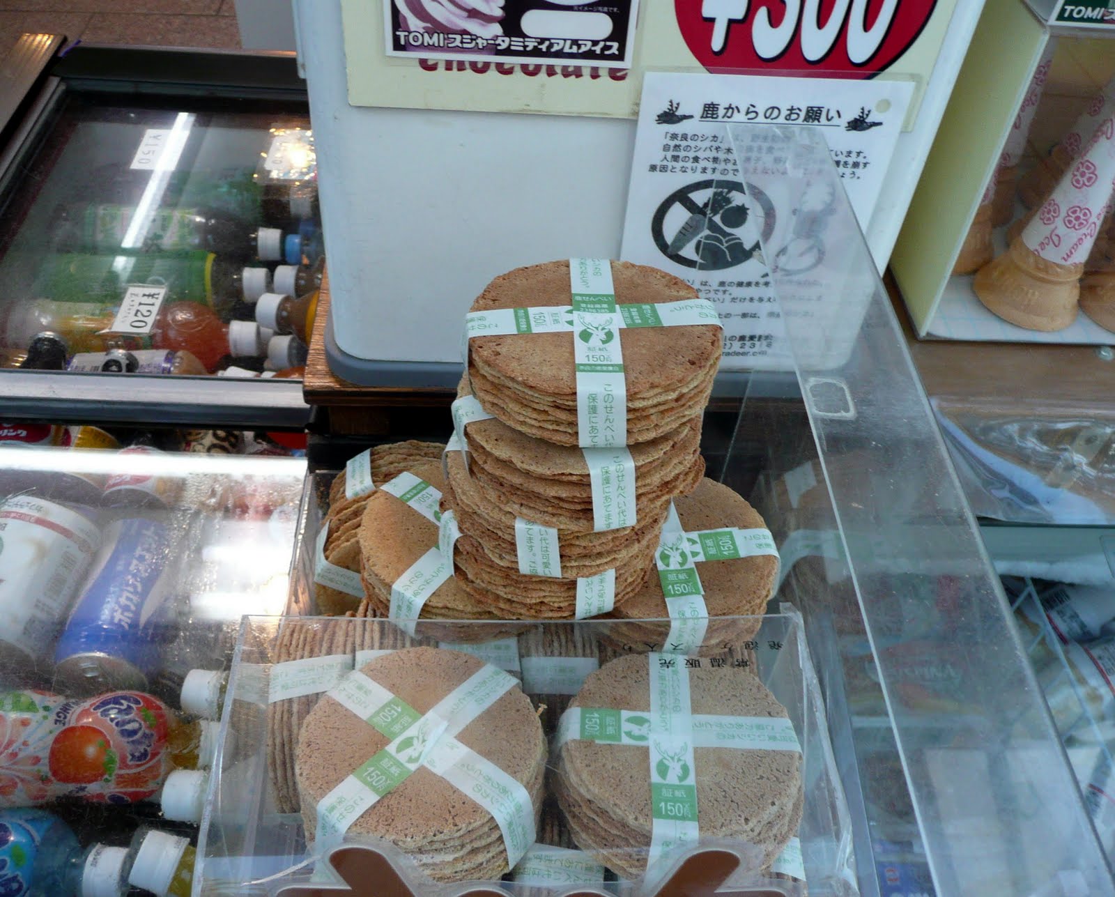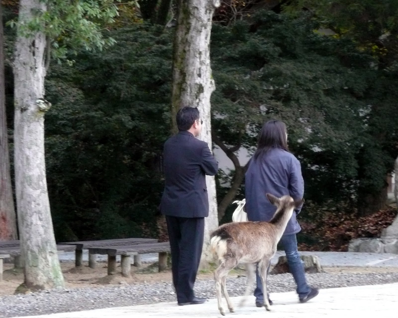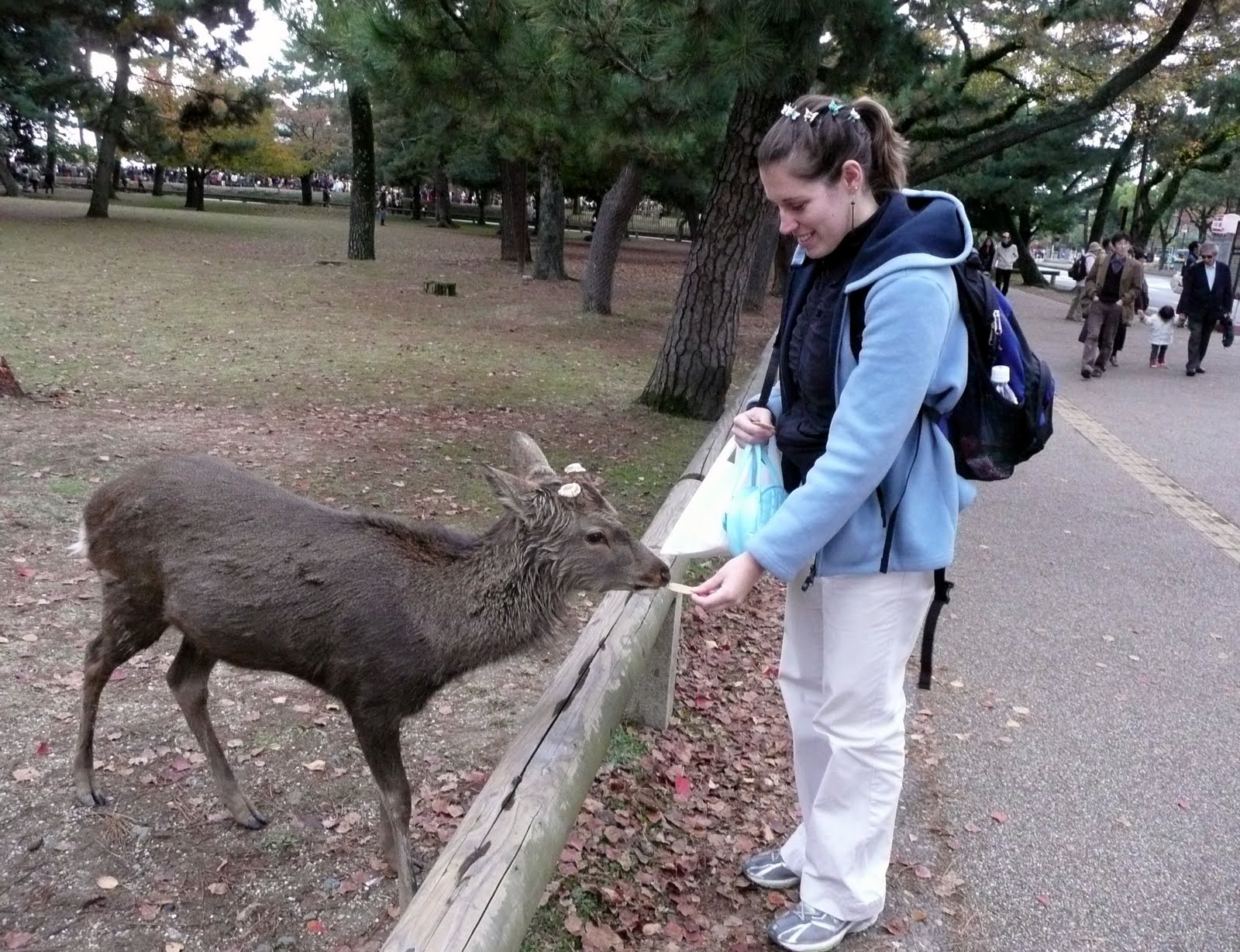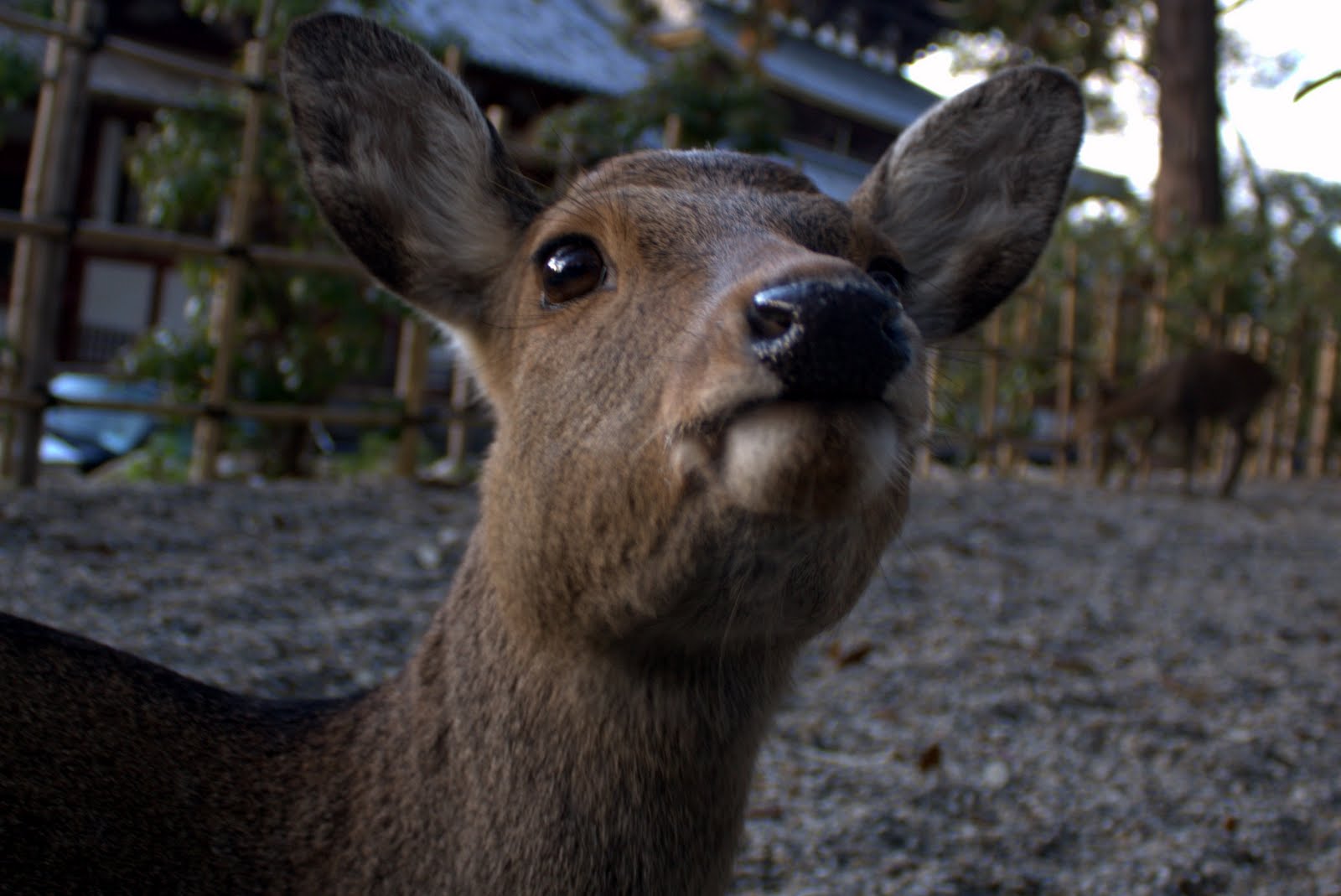 The deer know where the deer cracker booths are located and stalk the sidewalks where they are sold. We saw them bunting people in the butt to try and get crackers. Some of the deer look a little mean and you would not want to mess with them. However, they are quite harmless. People live side by side with the deer and the deer walk down the sidewalk as citizens of Nara. People even sweep the deer droppings up behind them. We missed the Deer Antler Cutting Ceremony in October (Shika no Tsunokiri). I guess the deer have been protected by the people of Nara because in ancient times the god of Kasuga was seen riding on a white deer. In the Edo period there were lots of deer, so the event started to protect local people from the deer. Men known as Seko hold down the deer while a Shinto priest gives the deer water to keep him calm while his antlers are cut off. The antlers of course grow back again the Spring.