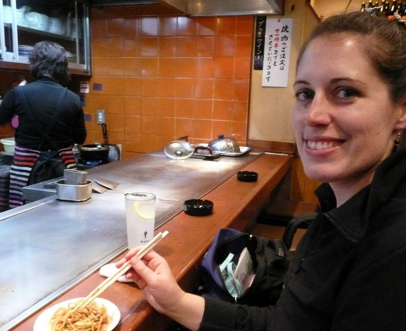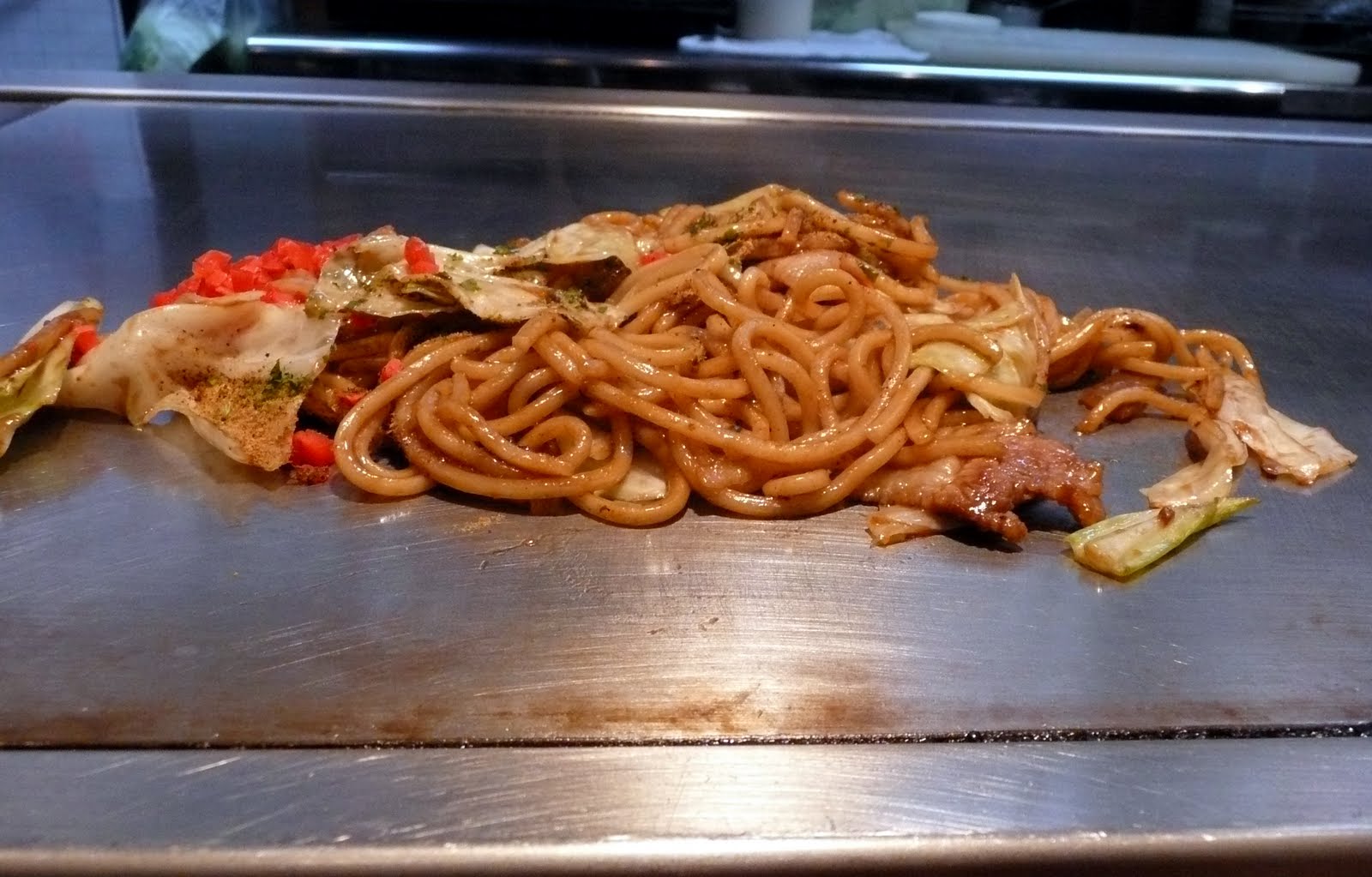 Yakisoba: one piece of bacon, soba noodles, cabbage, pickled rasish, onion, rectangular pieces of some sort of jelly stuff and spices stir fried on a grill in a great sauce.