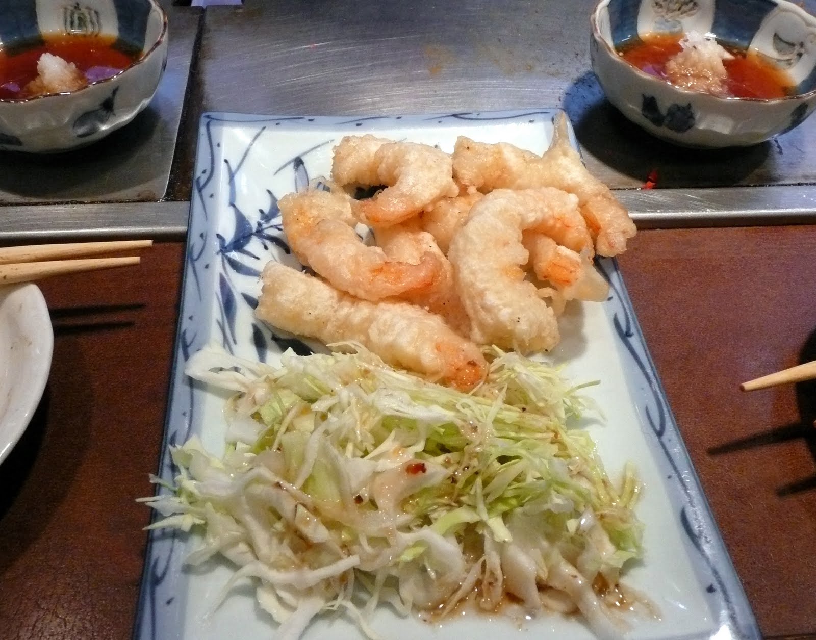Shrimp tempura: served on a bed of cabbage with ginger hoison sauce.