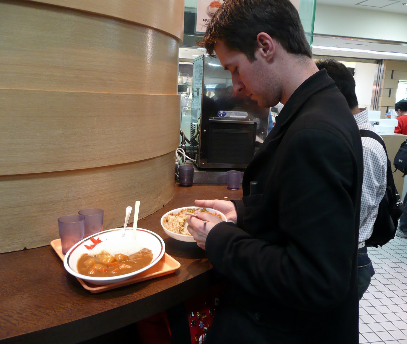 However, first we discovered the Food Park. It's a food court with various types of Japanese food and you eat it standing up at a little island that has a hole in the middle for your bags. We both had a wonderful spicy curry soup for $3.00 Canadian. We need one of these places in downtown Edmonton. Perhaps Colin and I should open up a place when we're back.