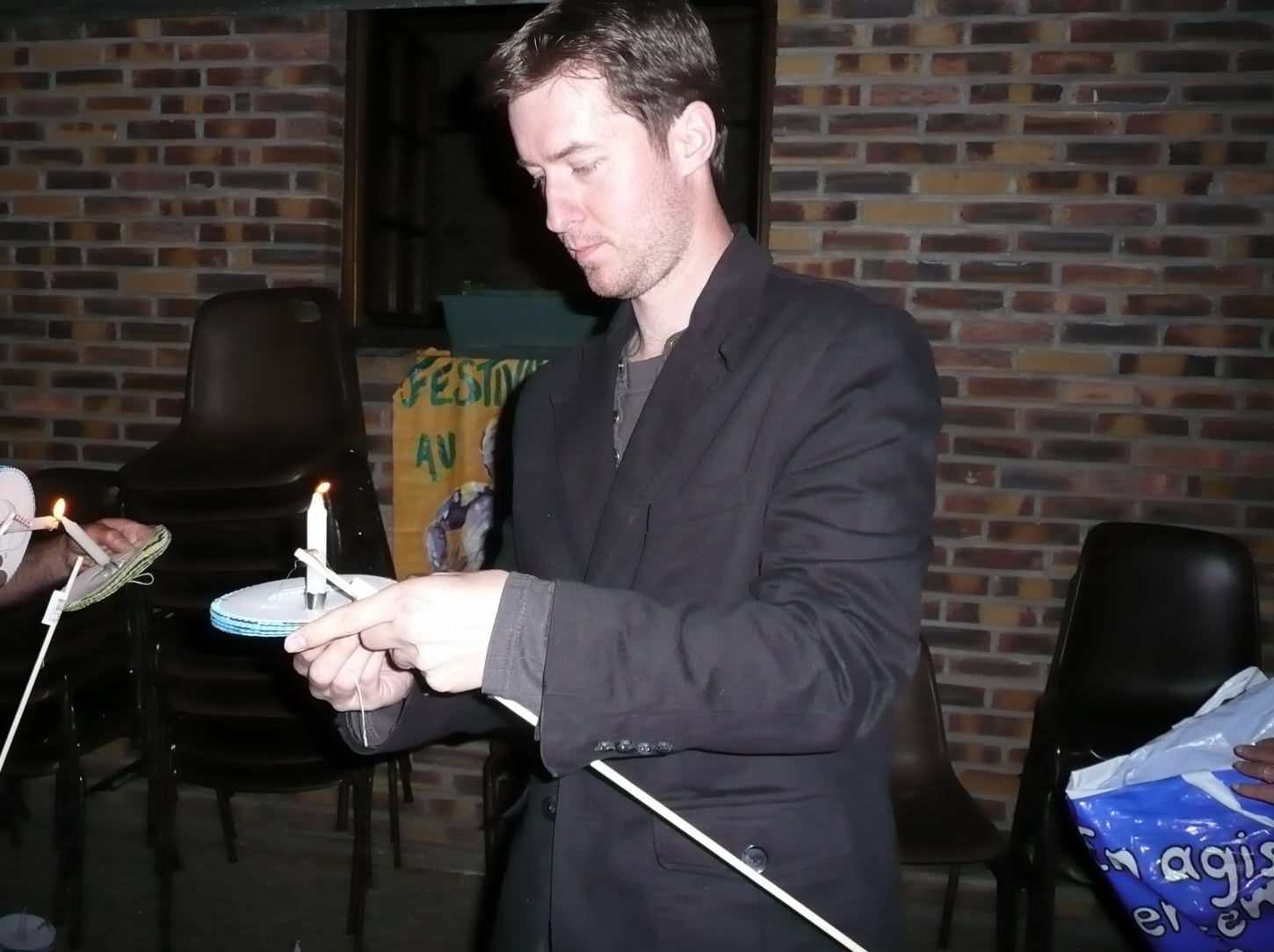 The festival was at a community hall. The patio area was decorated with coloured lights and lots of art work. We had biere and chili for supper with the exception of Colin who had a baguette with 2 barbecued sausages in it. When there are festivals in France there are always lanterns and confetti involved. We helped light and hand out paper lanterns with tall candles inside them. Once all the lanterns were lit, we followed a band that was parading through the streets with a dancer in front of them. The dancing girl could really shake her booty. While we were walking, Isabelle's lantern fell off the stick and it burst into flames.