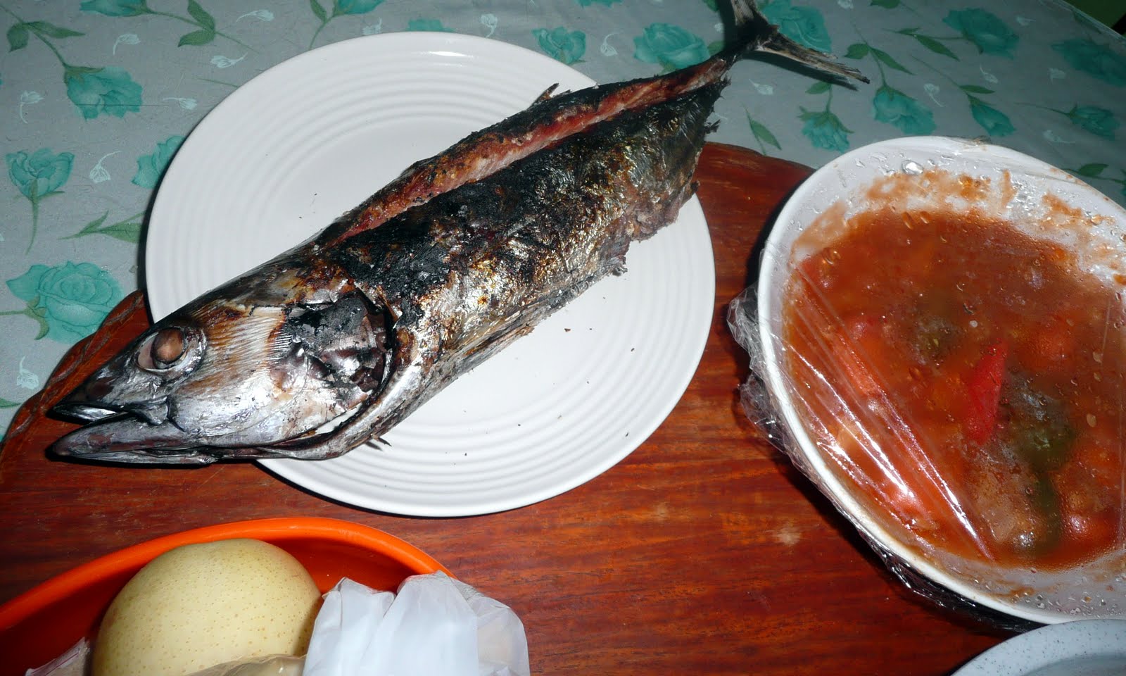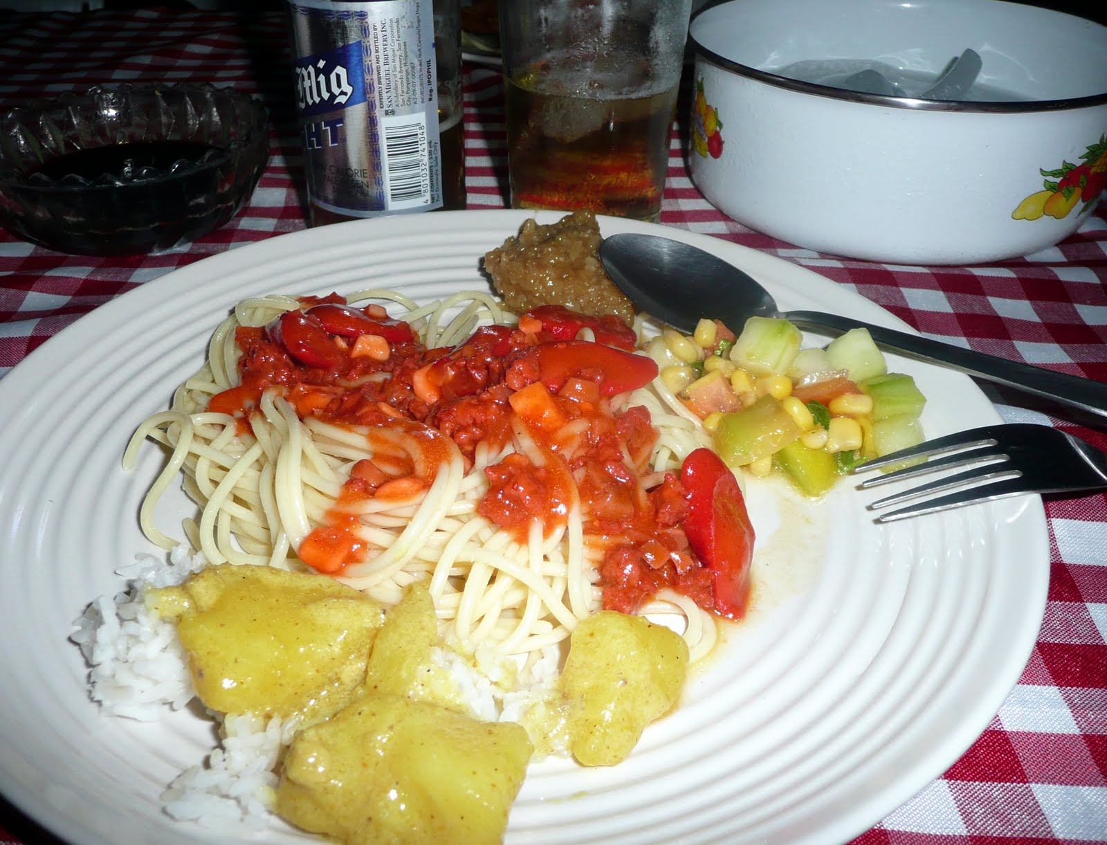 We had a New Year's eve supper which consisted of grilled fish, Filipino spaghetti sauce (sweet tasting with hot dogs and cheese in it and it's an odd pinkish red colour), curried chicken, rice, and mango salsa. We also had my favourite dish from Christmas which was sticky rice with coconut and it's delicious.