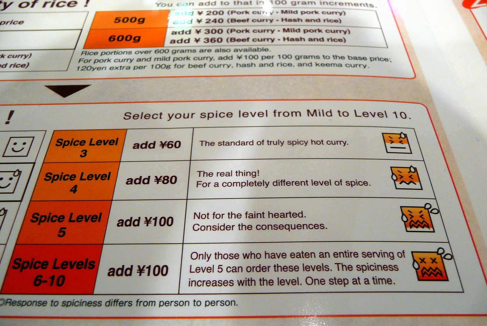 Colin and I really enjoyed the food in Tokyo. There are many great restaurants for soba, sushi, and curry. My favourite curry restaurant is the Ichibayna CoCo Curry House. You walk in the door and are greeted by a whiff of delicious spelling curry. As soon as you're seated, you're given glasses of water and a pitcher (because you'll need it). You get to pick the amount of rice you want, the meat, the veggies and the spiciness of the curry. During our first visit, I tried a 4 and it was perfect. During our second visit, I had level 5 in a chili dish and it was too spicy for me. I couldn't taste the meat or veggies. My mouth felt like a dragon breathing fire for the whole meal and I swear that I was sweating out curry for days afterwards. Be ware that they are not kidding about the descriptions on the spices. I can usually handle quite a bit of spice, but 5 is really spicy. Colin's nose was running when he ordered a level 3. I would pay to see someone eat a 10.