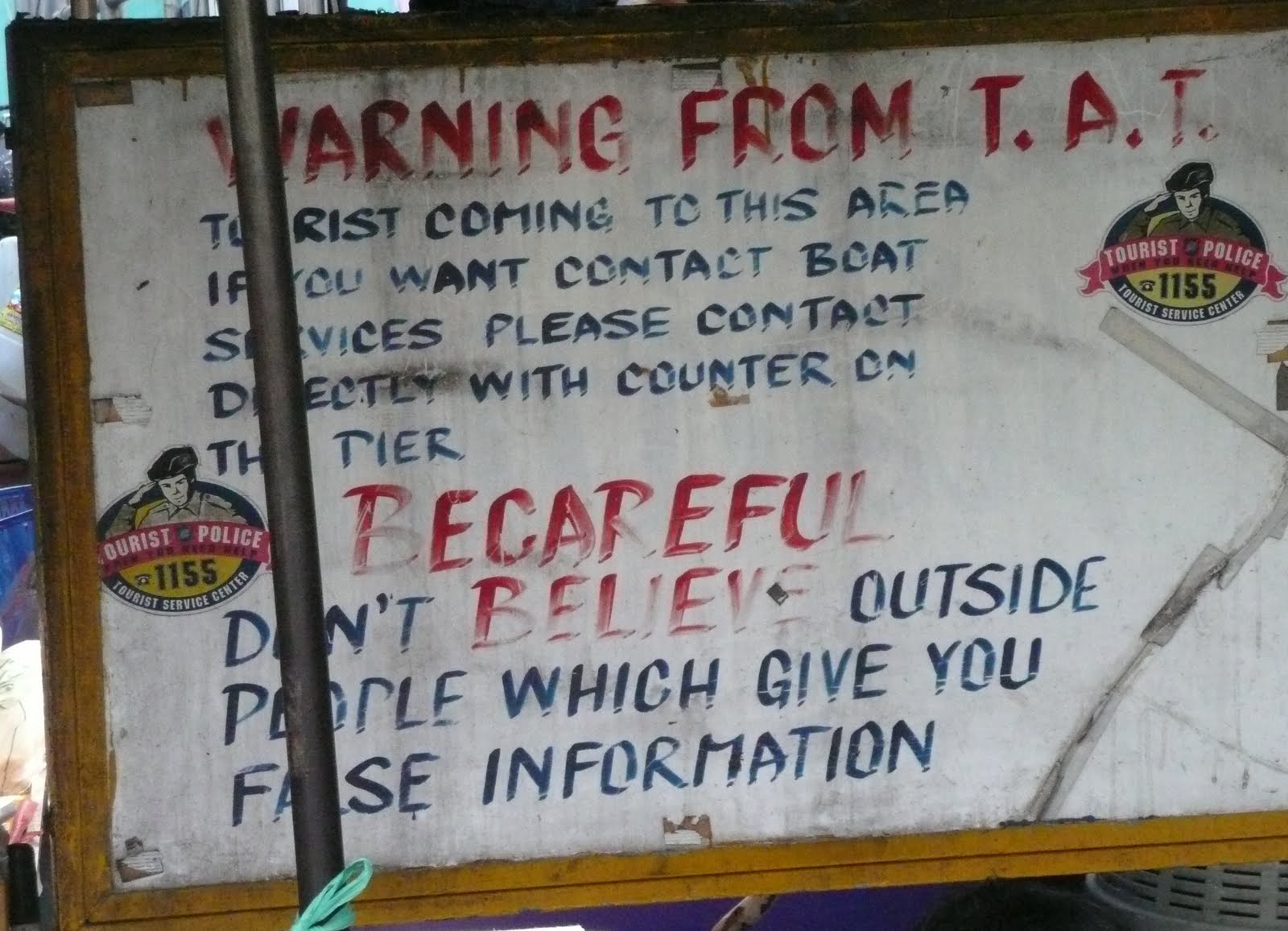 The government is aware of most of these scams and I believe that must be why there is the tourist police. There are warnings about being scammed by buying boat trip tickets off the street. We took a water taxi for 13 baht each and we paid on the boat. We did not need to buy a ticket ahead of time.