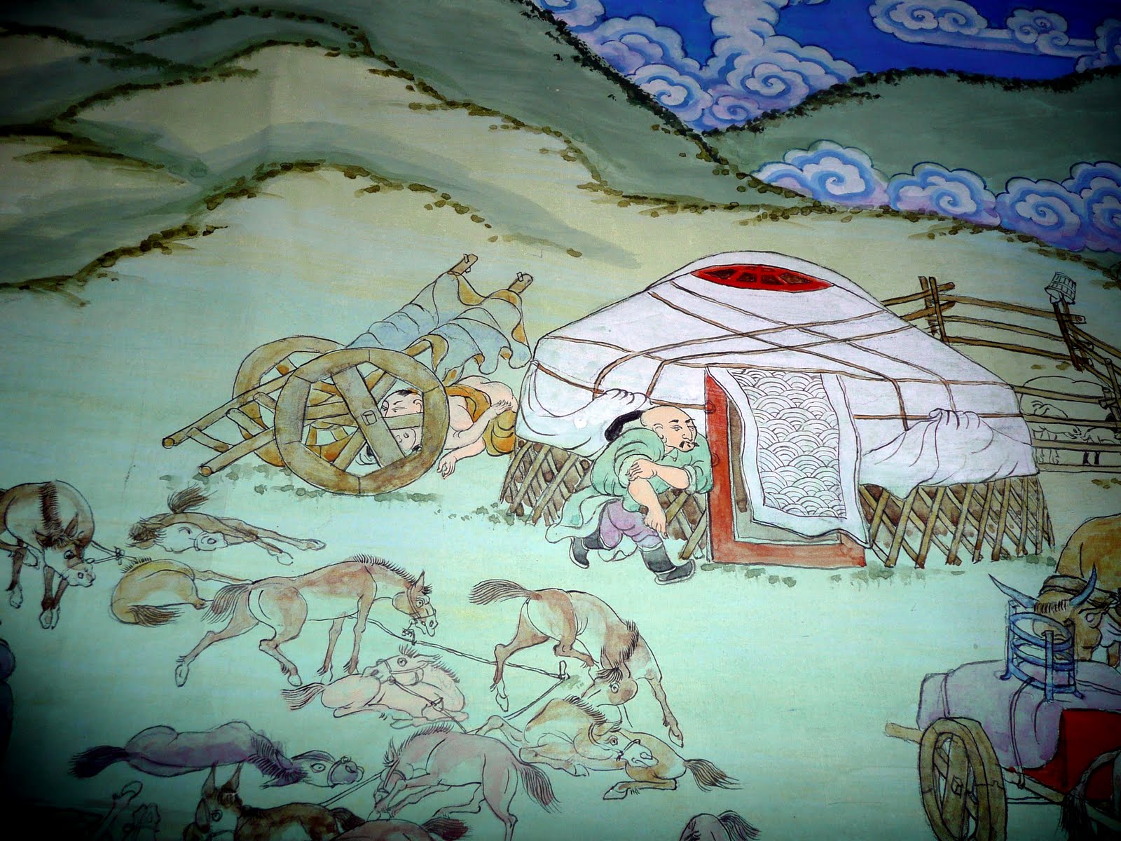 Look closely at what is happening behind the tent. This painting was in a temple.