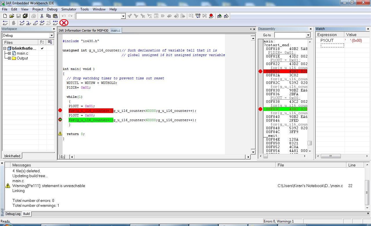 Due to breakpoint process of simulation will get halted. So that we can observe the change in the value of Port 1 register. We can see the value in watch window. The value is 0x01 as per written in code:
