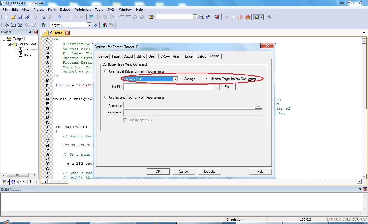 Now we are going to run the LED Blinking code on Target board directly by programming the Microcontroller. Click on Flash menu->Download: