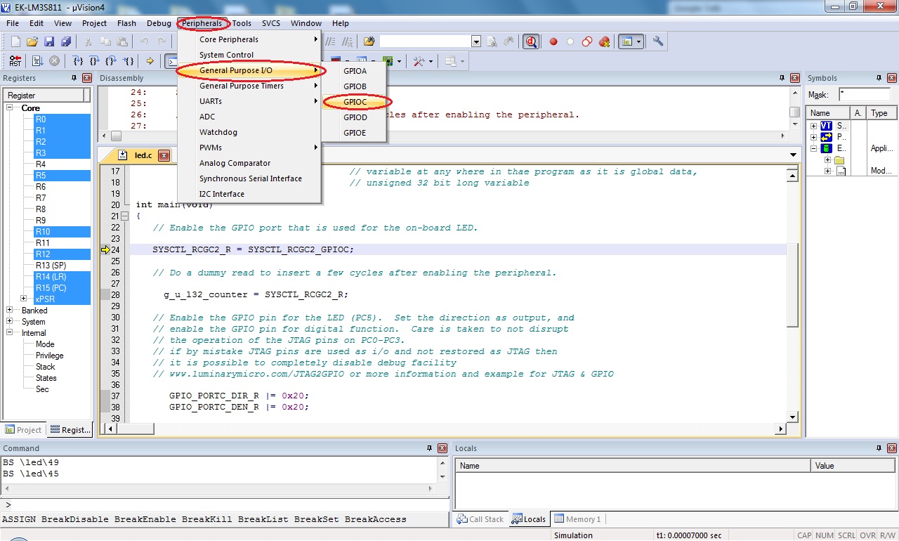 During simulation/debug session we want to observe status of GPIO C. So we will add peripheral window from Peripheral menu: