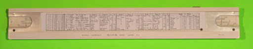 This rule boasts 5 log log scales on the back of the slide. On the front it has a BI for dividing by squares and a P (power) scale. There's a lot of useful stuff on the back, but alas, the only way I can read it is with a magnifying glass (or the image below viewed at full size).