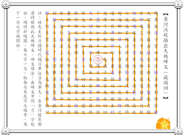 註:林先生於日據時代被日軍征召為軍夫,在黃河提岸崩潰時發現此天機碑文。碑文讀法:由碑文中間「弓」字起始,順時針繞圈,每七字一句,取每句末尾字之偏旁,為下一句之字頭開始。