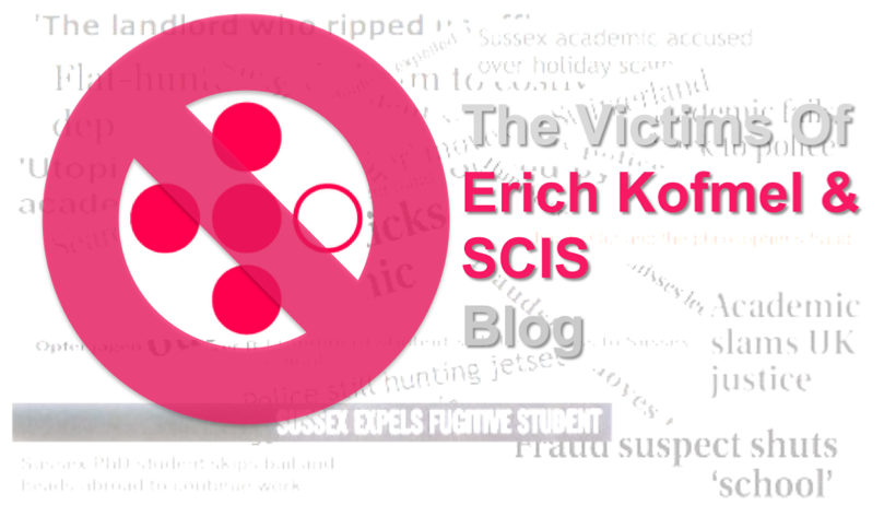 Mr. Kofmel set up the so-called "SCIS" whilst we was residing in private rented accommodation on campus at the University of Sussex. Indeed at that time the University of Sussex had to make it clear to theBBC that "The SCIS .... is not an officially recognised research centre at the university, nor does it have a formal base on campus.". [Source]