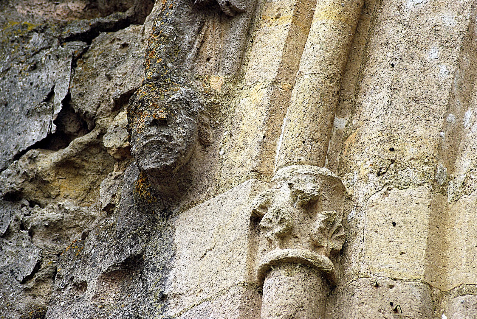 Curieux chapiteaux anciens encastrés dans les murs de na nef
