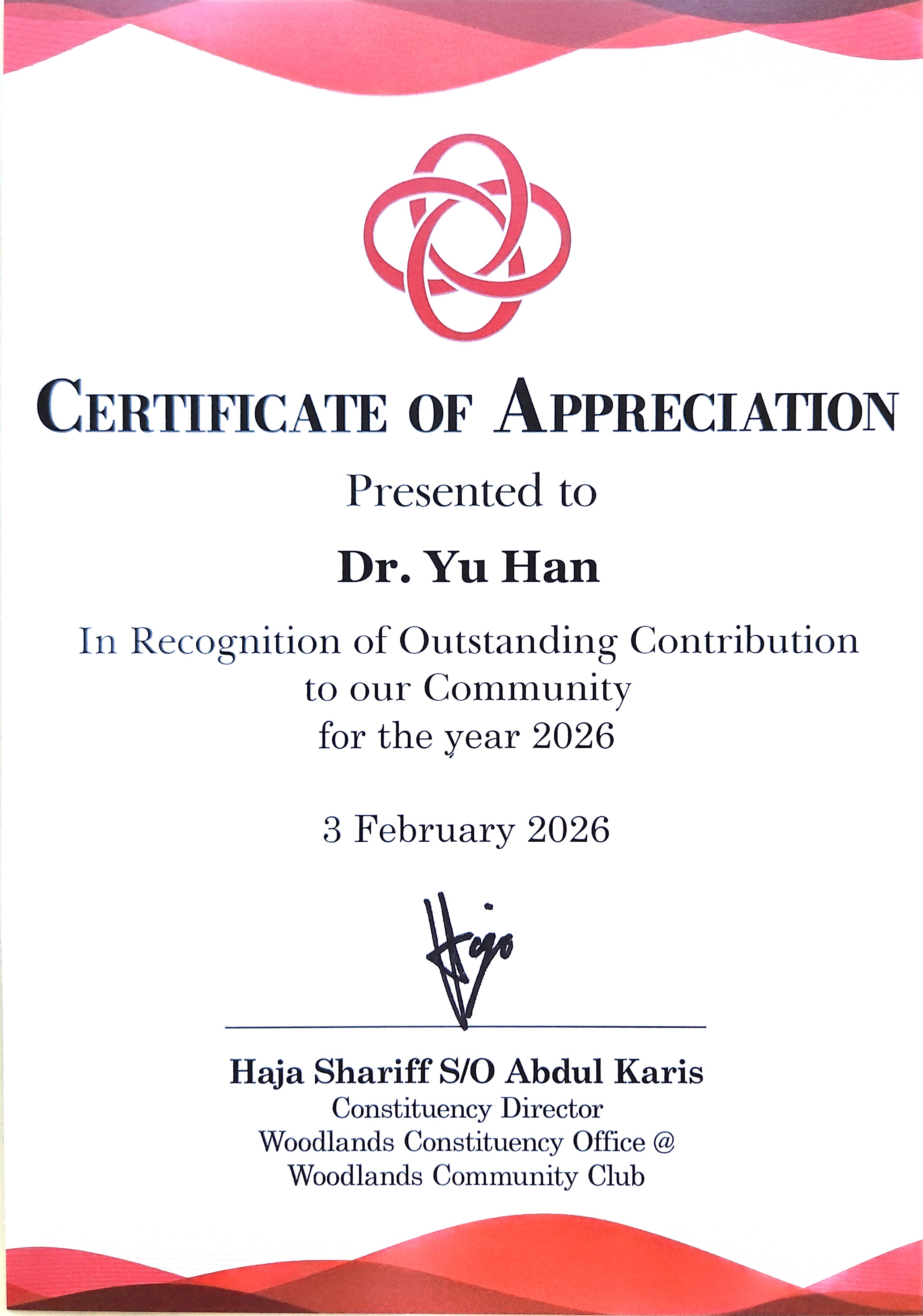 Certificate of Appreciation, Sembawang GRC (Woodlands), Singapore.
